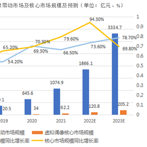 虚拟人指具有数字外形的虚拟人物。艾媒咨询数据显示,虚拟偶像产业保持稳定增长态势,2021年,虚拟偶像的带动市场规模和核心市场规模分别为1074.9亿元和62.2亿元,预计2022年将分别达到1866.1亿元和120.8亿元。
