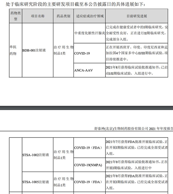 新冠肺炎疫情发生后,舒泰神单抗药物管线围绕补体系统,形成了以新冠重症治疗为核心的研发管线,在研项目 BDB-001、STSA-1002、STSA-1005均展开针对新冠重症治疗的临床研究。