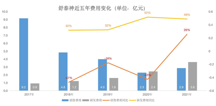 近五年,舒泰神的营销费用已经从2017年的最高值9.2亿元缩减至2021年的2.9亿元;研发费用则逐年增长,2021年研发费用为3.6亿元,较2017年的0.9亿元增长了293%。