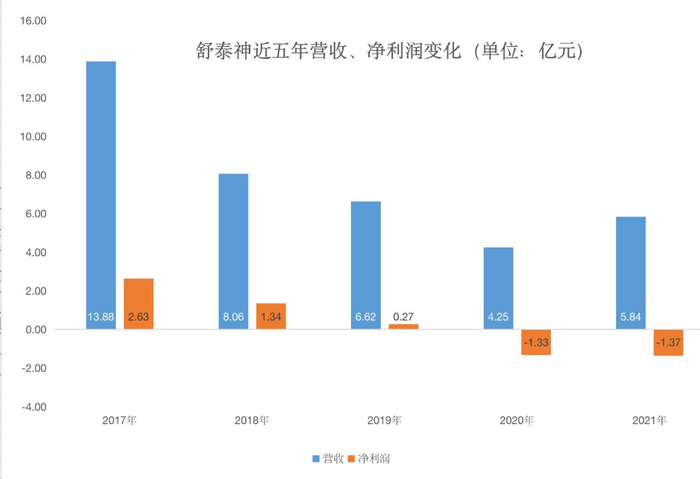 不过,这是在2020年较低的营收基数上实现的增长。从近五年来看,舒泰神的营收规模在逐年下滑,2021年营收虽然有所增长,但还没有达到2019年之前的营收水平。