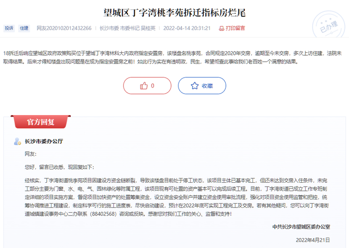 近日,有网友在问政湖南平台上反映位于望城区丁字湾街道的桃李苑安置项目烂尾,原定于2020年交付的楼盘至今未交房。中共长沙市望城区委办公室对此进行了核实并回复。