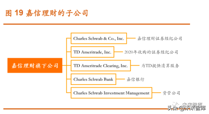 另一方面,随着金融科技迅速发展,互联网券商的竞争愈发激烈,降低 产品费率、交易免佣金成为趋势,证券业开启新一轮转型与并购整合浪潮。例如,Robinhood 于 2015 年采用零佣金交易模式,开创免佣金交易先河;2018 年,富达、先锋和摩根大通均先后推出了零费率或免佣金的服务;2019 年,“零佣金”大战打响,盈透证券、嘉信理财、亿创理财(E-Trade)、TD Ameritrade、富达等先后取消交易佣金,随后 TD 被嘉信理财收购;2020 年, 摩根士丹利宣布收购亿创理财,渠道和客户资源进一步加强了大摩在财富管 理的竞争力。因此,在“零佣金”的趋势下,基于存量客户的盈利模式显得 尤为重要。(报告来源:未来智库)