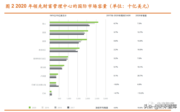 根据德勤的测算,从全球主要财富管理中心的离岸资产管理规模来看, 2020 年瑞士管理的国际资产价值达到 2.6 万亿美元,占据 23.7%的市场份额, 仍然是全球最大的离岸财富管理市场。英国和美国以 2.1 万亿美元和 2 万亿美 元的资产价值分列第二和第三。其中,17-20 年美国的离岸资产管理规模增速 高于瑞士和英国,而英国受脱欧影响,部分财富管理机构把业务转移至卢森 堡以承接欧洲客户需求,因此可以看到卢森堡的管理规模快速增长。(报告来源:未来智库)