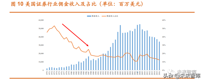 1975 年美国国会修订了 1934 年的《证券交易法》,取消固定佣金制度, 实行佣金自由化。此后,证券经纪业务竞争加剧,佣金收入下滑,美国证券 行业佣金收入占比从 1975 年前最高的 50%持续下滑至 2016 年的 12%。因 此美国券商尝试业务多元化转型,寻找新的业务增长点以及服务投资者的新 模式。例如折扣券商为零售客户提供廉价的经纪交易通道服务快速引流,同 时为其提供财富管理服务,衍生出基于 AUM 收费的买方投顾模式。