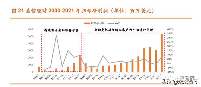 2000-2021 年,嘉信理财的营业收入从 52 亿美元增长至 185 亿美元,复 合增长率达 6.2%;归母净利润从 7 亿美元增长至 54 亿美元,复合增长率达 10%。为探究公司在不同阶段的经营表现,我们将嘉信理财的发展历程分为 五个重要阶段: