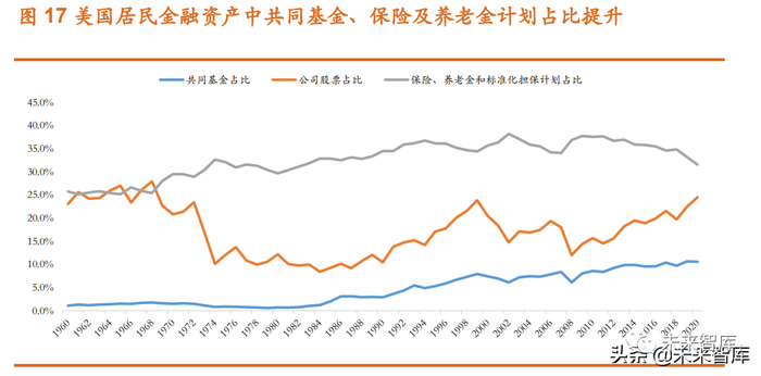 1974 年美国国会通过《雇员退休收入保障法案》,推出个人退休账户 (IRA),成为美国养老金体系的第三支柱。1978 年推出 401K 计划,是美国 在《国内税收法》新增的第 401 条 K 项条款的规定,是一种适用于私人营利 性公司,由雇员、雇主共同缴费建立起来的完全基金式的养老保险制度,横 跨了保险、储蓄、投资、贷款等业务,同时也属于缴费确定型计划(DC), 实行个人账户积累制。随着 IRA 和 401K 的推行,个人退休资产规模稳定增 长,资产投向主要是共同基金,其中占比较高的是权益类基金(股票型、混 合型),从而为股市带来长期增量资金。此外,居民金融资产中的共同基金、 保险及养老金计划占比均稳定提升,分别从 1970 年的 1.5%和 30%提升至 2000 年的 7.4%和 36%,反映出居民通过专业机构进行投资的意愿提升,财 富管理行业迎来快速发展期。