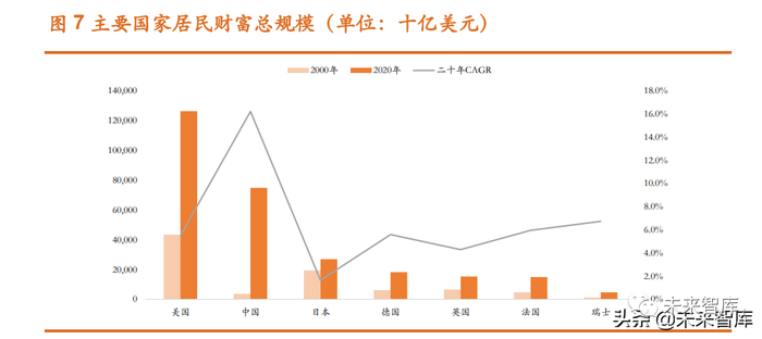 此外,2020 年美国居民总财富规模达到 126.34 万亿美元(2000 年为 43.4 万亿美元),排名第一,复合增速为 5.5%。人均财 富规模达到 50.5 万美元(2000 年为 21.5 万美元),位居第二。百万美元富翁 的数量占到全球的 39%,排名第一。值得注意的是,中国居民财富规模仅次 于美国,达到 74.9 万亿美元,2000-2020 年复合增速高达 16.2%,远高于 GDP 增速,但中国居民家庭的金融资产占比不足 30%,可见财富管理具备较大发 展空间。