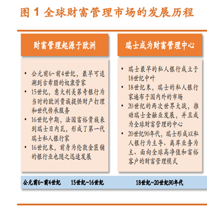 真正意义上的财富管理以瑞士私人银行的形式出现。瑞士最早的私人银 行成立于 18世纪中叶,日内瓦的经济受益于长期商业贸易的发展而欣欣向荣, 银行业得到迅速发展。随着货币兑换业务向资金融通及资产管理转移,出现 了专门为高端个人客户及其家庭提供金融服务的私人银行,成为近代私人银 行的起源。18 世纪末,瑞士的私人银行家遍布于国内外的市场,为国际客户 提供货币兑换、资金转移、资产管理、票据贴现等业务,私人银行的数目达 200 多家。20 世纪的两次世界大战中,瑞士一方面吸纳了来自欧洲王公贵族 和商人的大量资金、金融管理人才和经验;另一方面,二战时期瑞士凭借中 立地位的身份接收了大量海外转移过来的资金,推动了瑞士金融业的发展, 并且成为全球财富管理的中心。