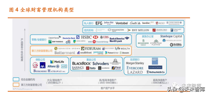 从提供产品和服务的个性化程度、客户资产水平两个维度,将全球财富 管理的主要参与机构类型进行划分。一类是服务高净值和超高净值客户的私 人银行、信托机构、家族办公室、投资银行以及部分全能银行,其中私人银 行、信托机构和家族办公室提供的产品和服务更具个性化。另一类是以服务 大众富裕客户为主的第三方财富管理机构和保险公司为主,其产品更加标准 化。