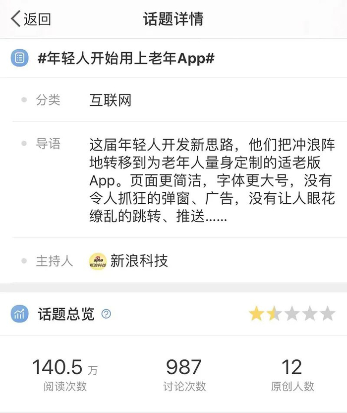 令人颇感意外的是,“适老App”简单易操作,不仅受到老年群体的欢迎,甚至还获得了一些年轻人的青睐。“年轻人开始用上老年App”一度成为微博热门话题。