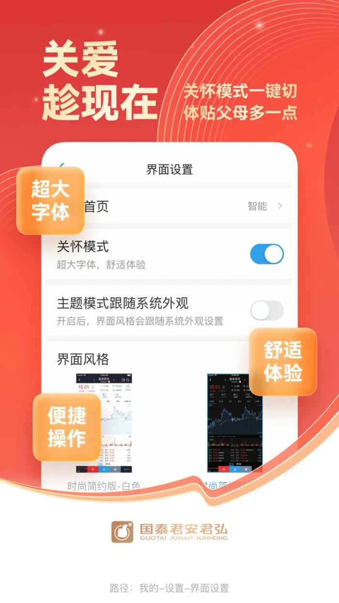 据介绍,去年9月,国泰君安君弘App依据两项规范草案在行业首发上线了面向老年人客群的“关怀模式”,率先进行了标准落地应用的实践探索。
