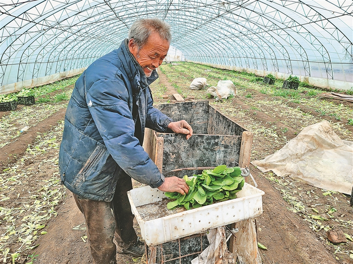 从采访开始,姜福斌手里的活就一直没停,不时还喘着粗气,他说:“现在大棚里都是活,干都干不完,哪有时间休息?”记者了解到,他家今年主要种植油麦菜,每栋棚产量在2~3千斤左右,刚刚上市销售的第一茬售价相当可观。