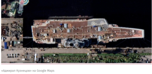 《乌克兰真理报》报道中的配图,该媒体称这是谷歌地图中的“库兹涅佐夫海军上将”号航母的图像