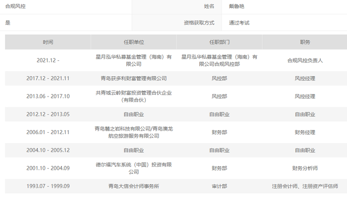 与戴鲁宁不谋而合的是,会计出身的星月泓华合规风控负责人戴鲁艳也曾有两段“自由职业”的经历,一次是2004年10月至2015年12月,一次是2012年12月至2013年5月。