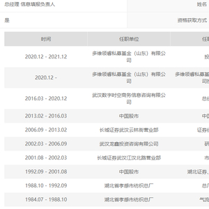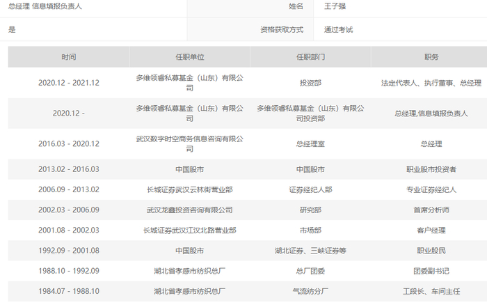 4月15日,多维领睿私募基金(山东)有限公司正式拿到了中基协的备案资格,担任总经理的王子强曾有两段、总计12年的“职业股民”经历,其中一段长达9年,另一段也有3年。