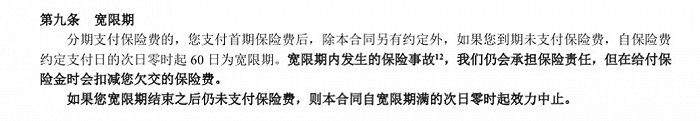 如果到了交费日,投保人未按时交费,那么自约定支付日次日起60天内,随时都可以补交保费,和按时交费无异。且在延期的时间内,受保人出险了需要理赔,保险公司仍然会正常赔付。不过不是所有的保险都有60天宽限期,对于消费型的长期险,付款的宽限期为30天。