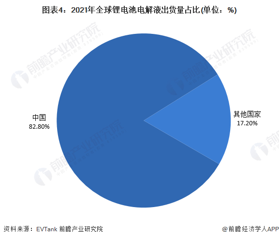 其中,中国为全球锂电池电解液的主要生产国家,2021年,全球范围内中国锂电池电解液的出货量占比高达83%,随着中国龙头电解液生产企业,如天赐材料等,持续不断扩产,未来中国电解液的占比将进一步提高。