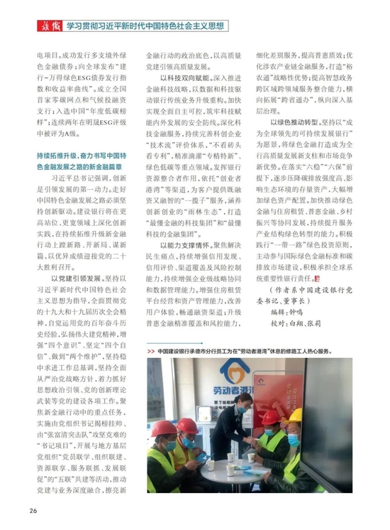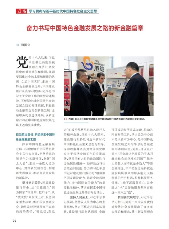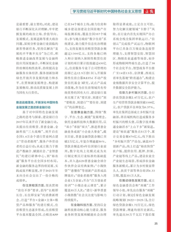 党的十八大以来,习近平总书记高度重视金融在经济社会发展中的重要地位和作用,他强调,“我们要深化对金融本质和规律的认识,立足中国实际,走出中国特色金融发展之路”。建设银行认真学习贯彻习近平总书记关于金融工作的一系列重要论述精神,不断深化对中国特色金融发展之路的规律把握,积极推动金融理念的创新性发展、金融服务的创造性延展,以新金融行动在中国特色金融发展之路上迈出坚实步伐。