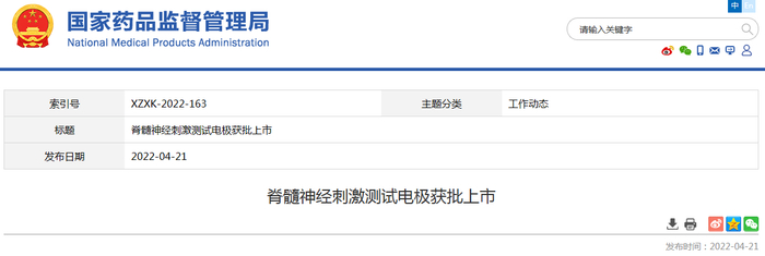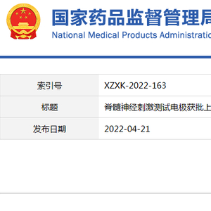 近日,国家药品监督管理局经审查,批准了北京品驰医疗设备有限公司生产的“脊髓神经刺激测试电极”创新产品注册申请。