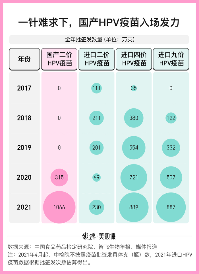 更便宜的价格、更广的接种年龄段,让馨可宁在上市的头一年便超过希瑞适,迅速抢占了国内二价HPV疫苗市场。到2021年,万泰生物一年批签发出去的二价HPV疫苗就达到了1066万支。