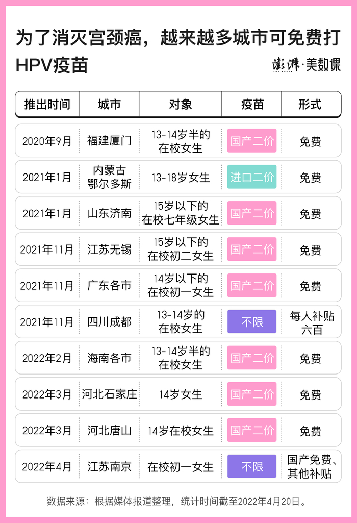目前,中国已有数十个城市开始试点HPV疫苗免费接种项目,首要接种的目标人群也多是14岁左右的女生。