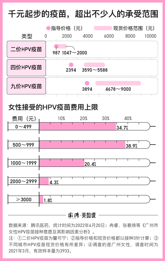 一份去年12月份发表在《中国公共卫生》上的调查显示,在广州市,四分之三的受访女性愿意接种HPV疫苗,但超过七成的人无法接受在HPV疫苗上花费超过1000元。