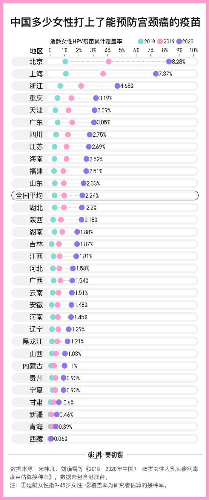 根据中国疾病预防控制中心免疫规划中心的宋祎凡等人估算,从2016年7月葛兰素史克成为中国首支获批上市的HPV疫苗起,到2020年年底,中国适龄女性的HPV疫苗接种率为2.24%。北京、上海等城市疫苗接种率虽然在国内排名前列,但也仅达到了百分之七、八。