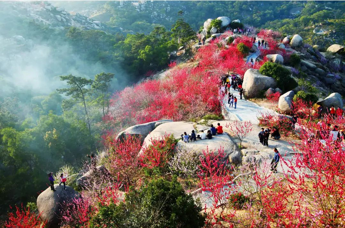 濠江巨峰寺山水相互辉映,景色秀丽,名胜古迹坐落其中,自然人文景观相互融合。每到春天,桃花漫山遍野、灼灼芳华、如烟如霞,整个景区被染得春光旖旎,吸引八方游客前来登山赏花。