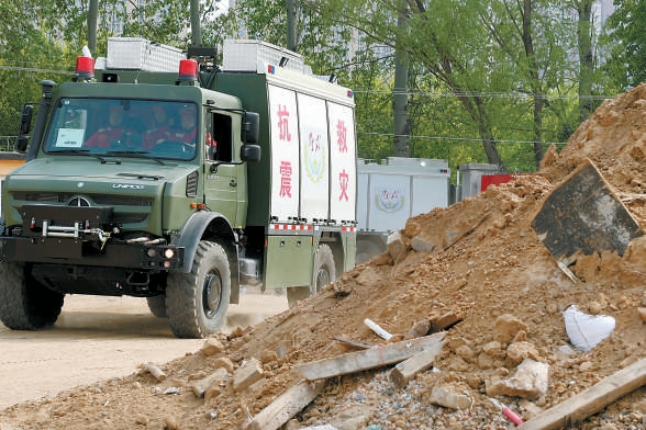 接到命令后,一辆救援指挥车带领着三辆地震救援车拉响警报,火速赶往救援演练现场。
