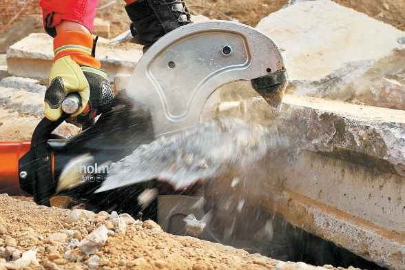 队员操作液压混凝土破碎机,利用钢铁巨钳夹碎水泥板。
