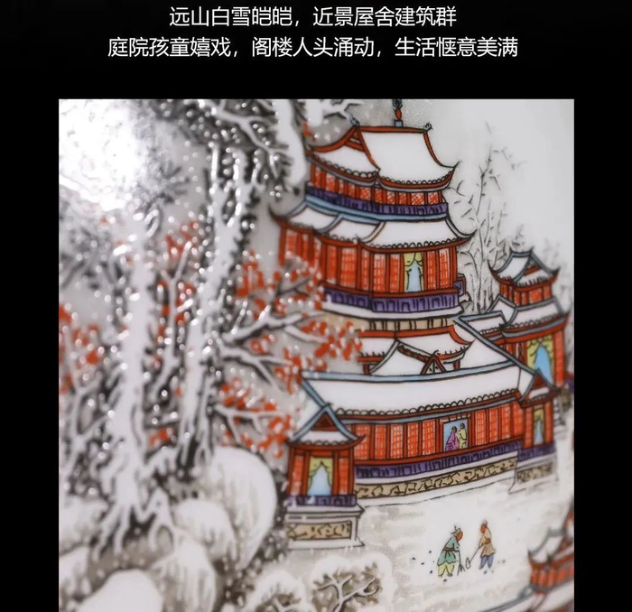 中景树木环绕;楼阁中隐约可见人头涌动,画面多为白雪皑皑,唯楼阁、人物着以粉彩,形成鲜明对比,顿显生机!