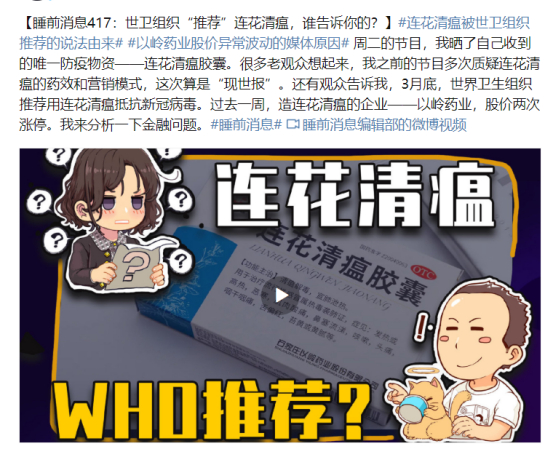 该内容称,近日有多家网站以“世卫组织认可中医药治疗新冠疗效连花清瘟防治获得可靠依据”“世卫组织认可!连花清瘟为全球战疫贡献‘中国智慧’”“中医药抗疫大显神威,世卫组织证明安全有效,并向会员国推介”等为标题发布文章。这些文章的来源指向为世界卫生组织3月31日在官方网站发布的《世界卫生组织中医药救治新冠肺炎专家评估会报告》(下称报告)。原微博称,该报告中只说鼓励各国考虑中国摸索的中西医结合治疗模式,同时,这只是一条建议,更没有提到连花清瘟胶囊。这些文章将以岭药业和世卫组织的会议联系起来,推动以岭药业股价飙升。