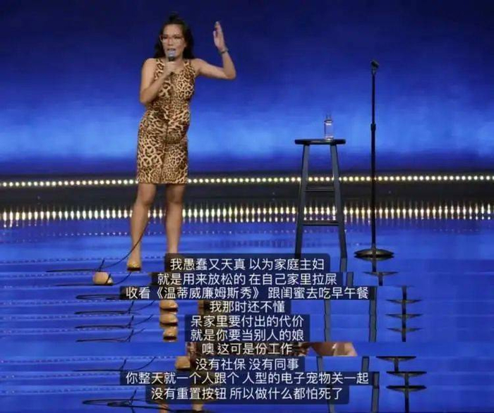 在女性单口喜剧演员的笑话中,似乎一直围绕着自己的家庭生活展开,沉重的家务、一无是处的丈夫,以及他们日常生活里积沙成塔的“小矛盾”。在调侃自己母亲身份的同时,也隐晦地指出了母职的艰难之处,比如父亲的失职和母亲的劳累。