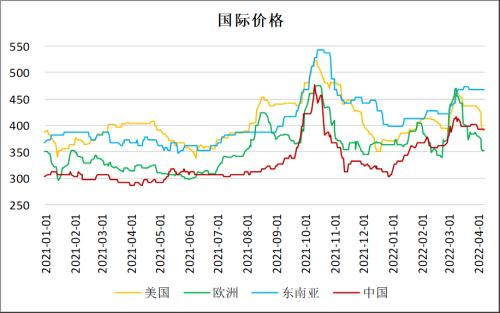 中国及东南亚价格一季度整体呈现阶梯式上行走势,近期中国价格略有走弱。