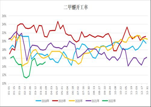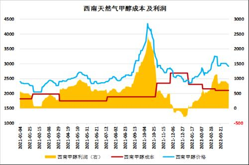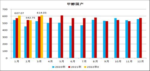 2022年一季度,我国甲醇产量约为1764万吨,高于去年的1711万吨,主要是产能同比增加较多,开工率同比略低但相差不大;2022年,预计产能增幅约3.4%,全年产量约为7166万吨。