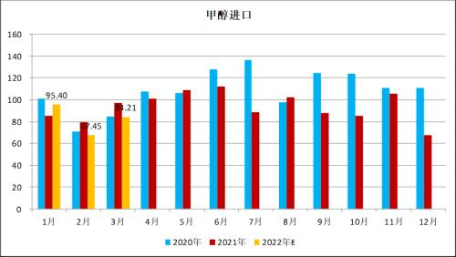 2022年一季度,我国甲醇进口量约为247万吨,低于去年同期的261.5万吨。