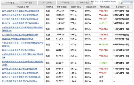 其中,银华心佳两年持有期混合持有191.24万股,增持38.78万股;汇丰晋信动态策略混合A持有106.62万股,增持96.92万股。