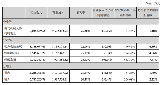 具体来看,宁德时代2021年锂电池材料毛利率为25.12%,增长4.66个百分点;动力电池系统毛利率为22.00%,减少4.56个百分点;储能系统毛利率为28.52%,减少7.51个百分点。