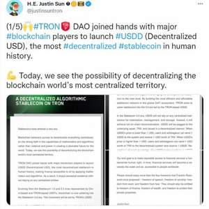 2022年4月21日,去中心化稳定币领域迎来重磅玩家。波场TRON创始人孙宇晨通过推特发表公开信,宣布正式进军去中心化稳定币,上线USDD(Decentralized USD)。并且,波场DAO将联合区块链行业的主流机构发起成立波场联合储备(TRON DAO Reserve),来推动以数学与算法实现人类的金融自由。