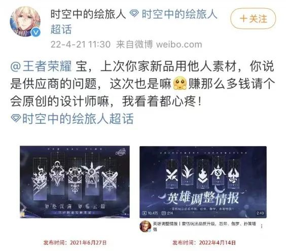 4月21日,网易旗下手游《时空中的绘旅人》官方微博发文喊话腾讯旗下《王者荣耀》:宝,上次你家新品用他人素材,你说是供应商的问题,这次也是嘛?赚那么多钱请个会原创的设计师嘛,我看着都心疼!并配两张对比图,指王者荣耀海报涉嫌抄袭。