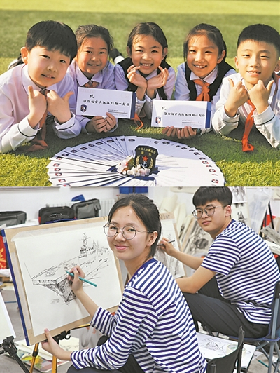 图③:古镇口海军中学学生用书画表达对官兵的敬意。