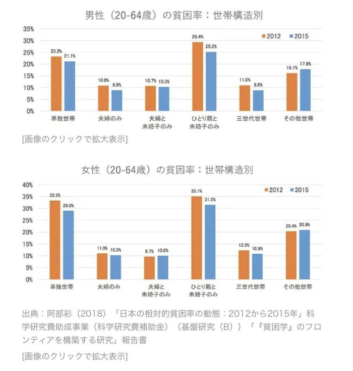 (男性女性贫困率的家庭类型构成情况,出处:阿布彩(2018)《日本相对贫困率的动态:2012至2015年》,图源:日経ビジネス)
