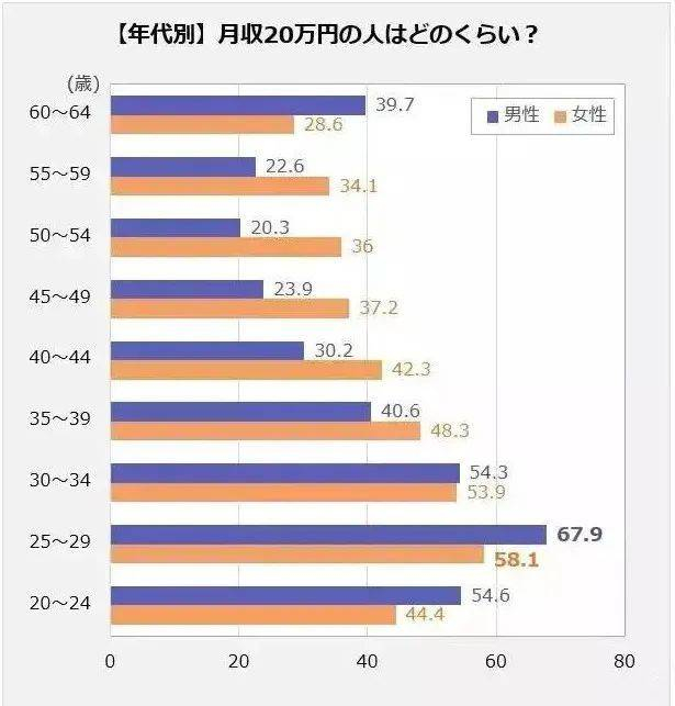 (需要说明的是,比例之外的只代表月收不为20万日元,不代表月收低于20万日元,比如60~64岁男性中月收为20万日元的人占比39.7%,那么剩下的60.3%可能月收低于20万日元也可能高于20万日元)