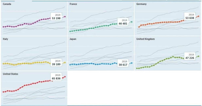 (这组图片也反映了G7各国1990年~2019年平均年收增长的幅度,七国中只有日本和意大利是趋近于水平线的)