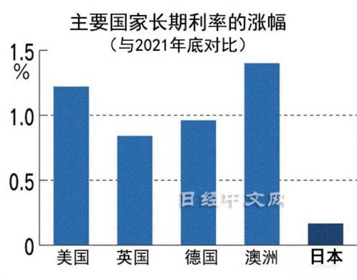 (日本的长期利率从2021年底的0.07%涨到了4月的0.23%,涨幅仅0.16%,对比欧美澳明显小很多,图源:日经中文网)