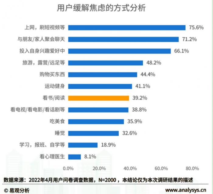 不过,在生活的快节奏之下,阅读并非为疗愈焦虑的最优解,人们更青睐高效快速的方式。数据显示,75.6%的用户选择上网刷短视频缓解焦虑,投奔阅读的仅有39.2%——这个比例在一线城市较高,达50.8%。实际上,超六成用户每日休闲时间不足两小时,需要更专注、更长时间的阅读不敌更快更轻松的短视频。