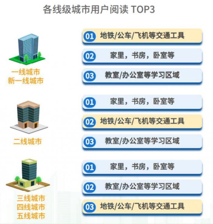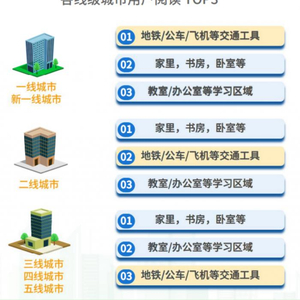 而且越往高线城市,用户通勤时阅读占比更高,上下班时的远距离通勤,成为了一线和新一线城市的工作党珍惜的阅读时刻。相比之下,低线城市用户更偏爱在家里阅读。