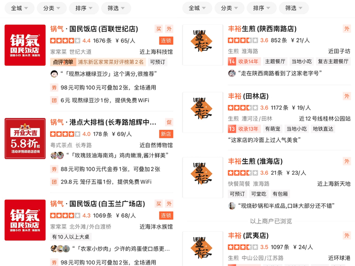 界面新闻在大众点评上发现,锅气、湘轩酒楼、丰裕生煎皆为上海具有一定知名度的餐饮品牌,其中锅气有23家连锁门店。