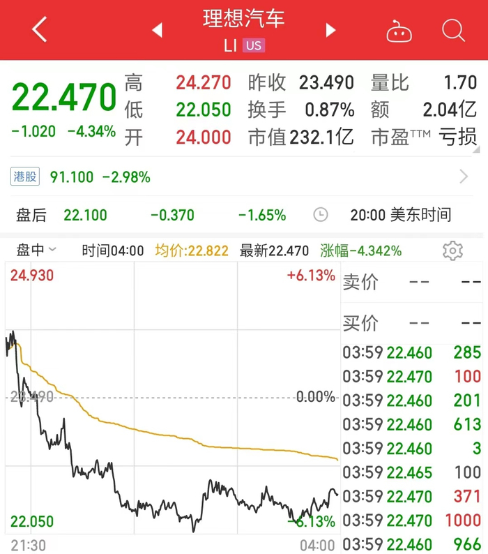 4月21日,理想汽车美股跌4.34%,收于22.47美元。