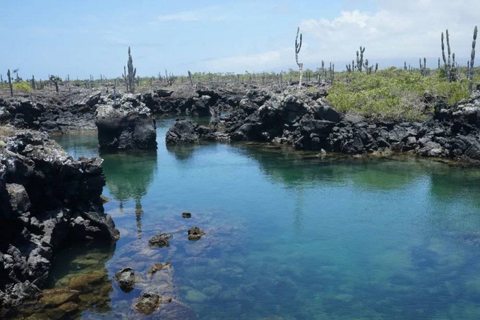 下午,我们去作圣克鲁兹岛海湾游。途中经过蓬塔卡马尼奥岛。旅客可在海中浮潜或上岛走走。我们在冰蓝的小湖和巨型仙人掌林之间穿行,一路仍然需小心踩上巨型鬣蜥。海湾游的最后一站是拉斯格里塔斯(Las Grietas),其意为岩缝。